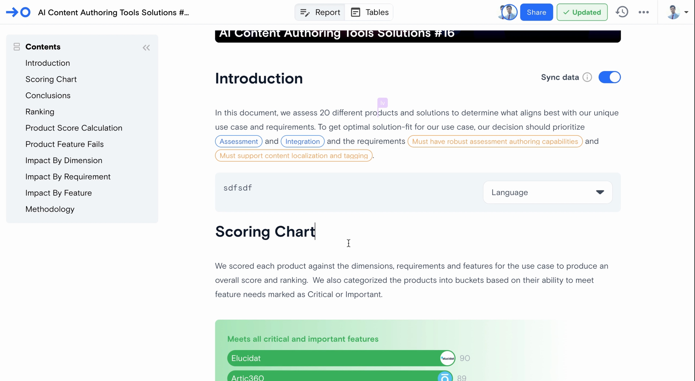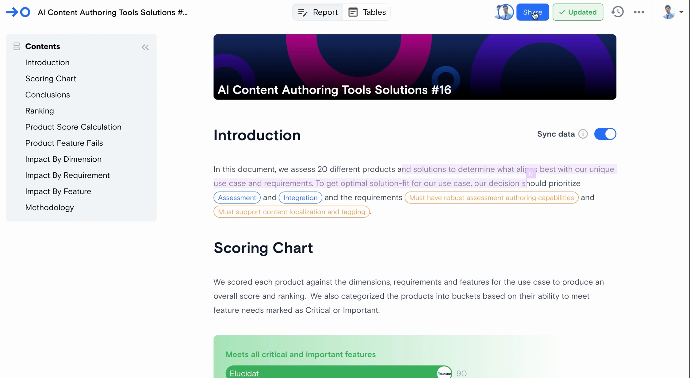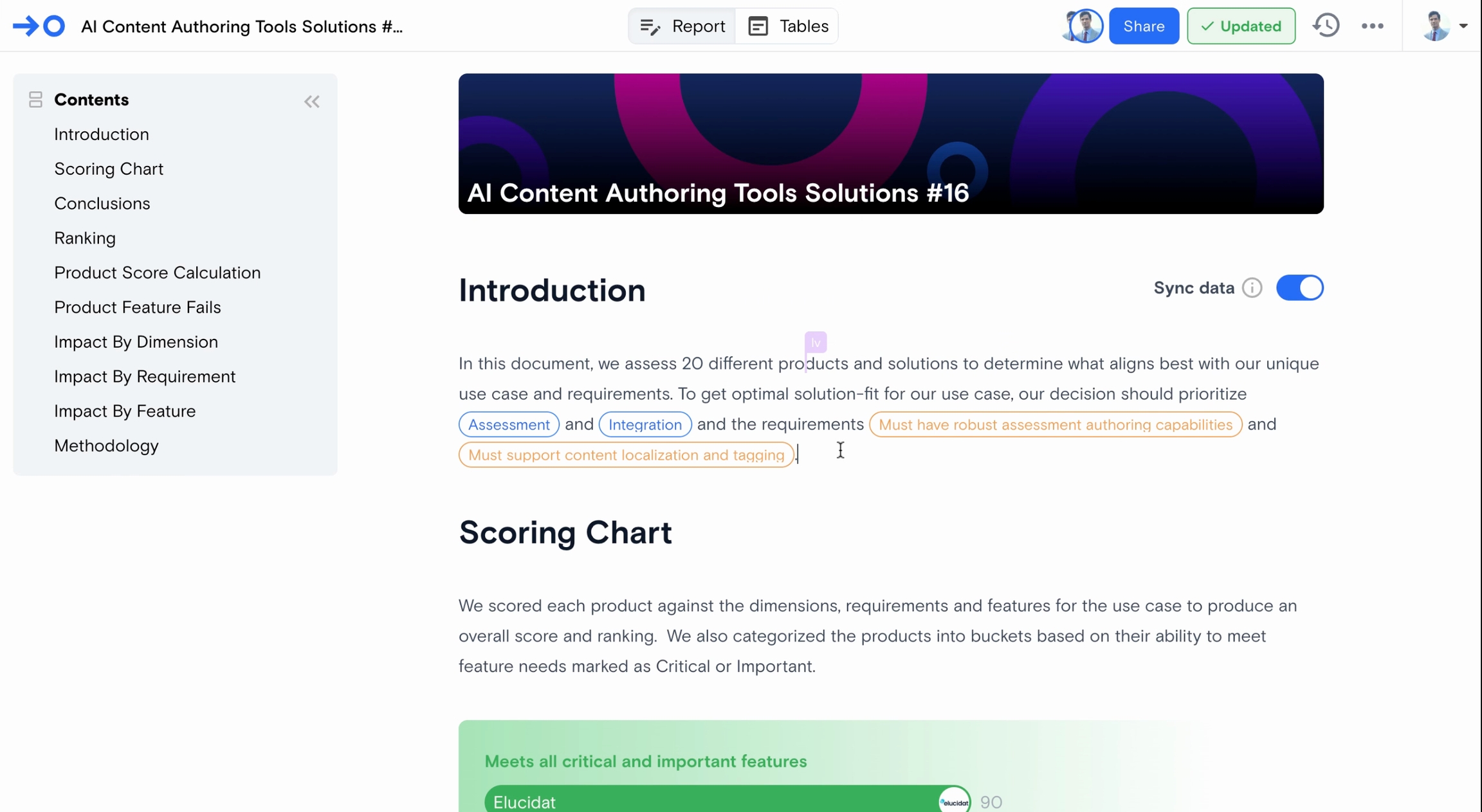 To provide additional context to discussions or documentation, use the slash (/) command to reference specific products, features, requirements, or dimensions from your evaluation. This links information effectively and keeps everything connected within the workspace.